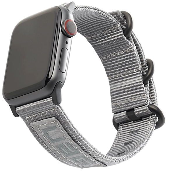 UAG Apple Watch 40mm/38mm Nato Strap Built for everyday adventures, our Nato Strap for Apple Watch is designed for dependability. A combination of materials - high strength nylon and stainless steel hardware- gives you the strength, durability and comfort you need to keep going further. Nato-Inspired Design High Strength Nylon Weave Stainless Steel Custom Hardware Designed for Apple Watch Series 1-5 Strap is one size fits most wrists 44/42mm: 152mm - 210mm 40/38mm: 133mm - 191mm