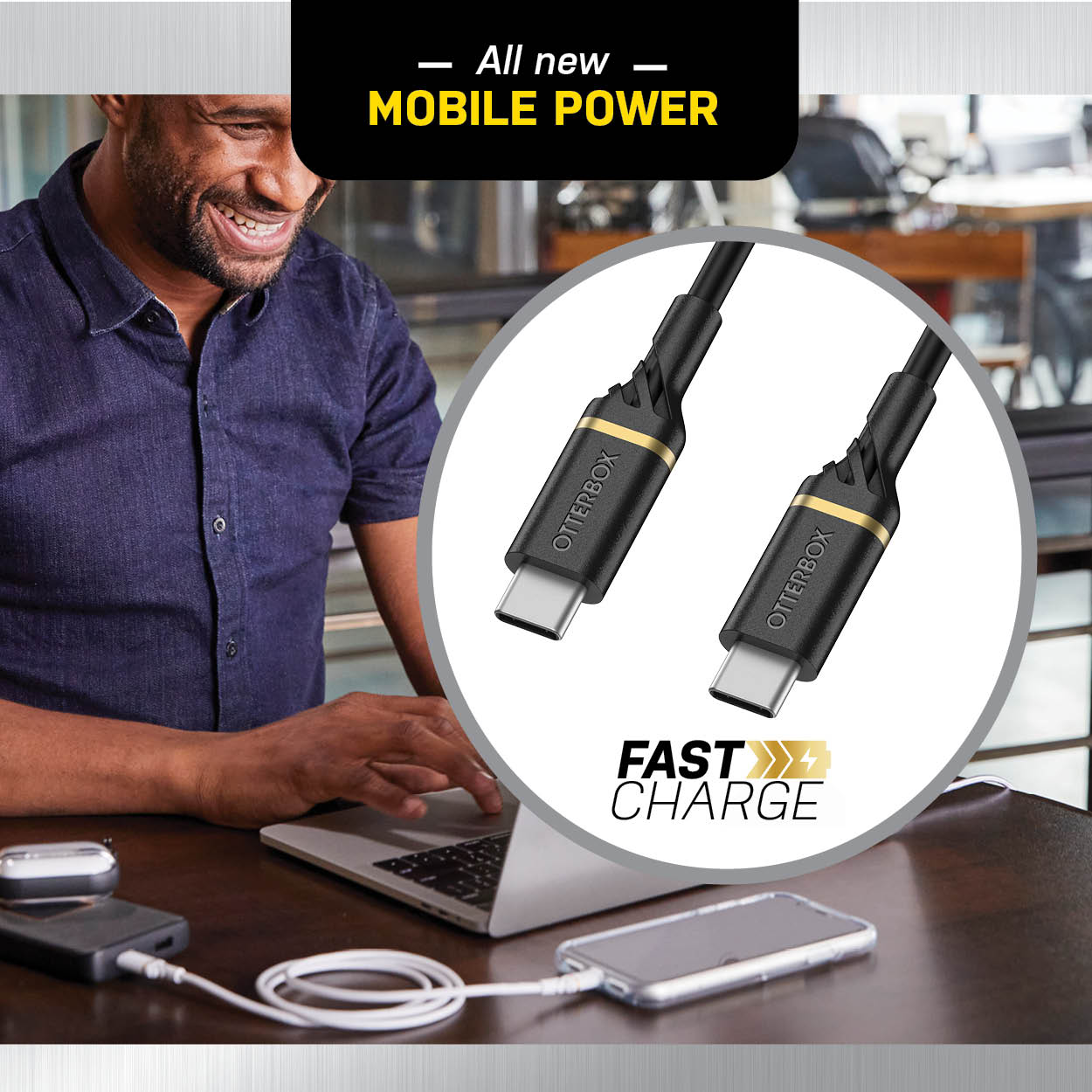 OtterBox USB-C to USB-C Fast Charge Cable - Standard 2 Meter OtterBox USB-C to USB-C fast charge cables are thoughtfully designed with industry-leading mobile expertise and proven quality that is durable and dependable. Up to 4X faster charging* so you won’t miss the moments that matter most Durable, trusted and built to last Bend/flex-tested 3,000 times for dependable use Flexible exterior cord coating for quality feel and finish Designed to work flawlessly with your favorite OtterBox cases and accessories Supports USB Power Delivery fast charging technology Limited lifetime warranty and no hassle customer service *Delivers up to 60W via Power Delivery vs. 15W standard cable Connector Type: USB-C to USB-C Cable Specification: USB 2.0 / USB PD Current Capacity: 3 AMPS Data Rate: 480 Mbps Weight: 2 meter: 0.13-lb | 57.00-g