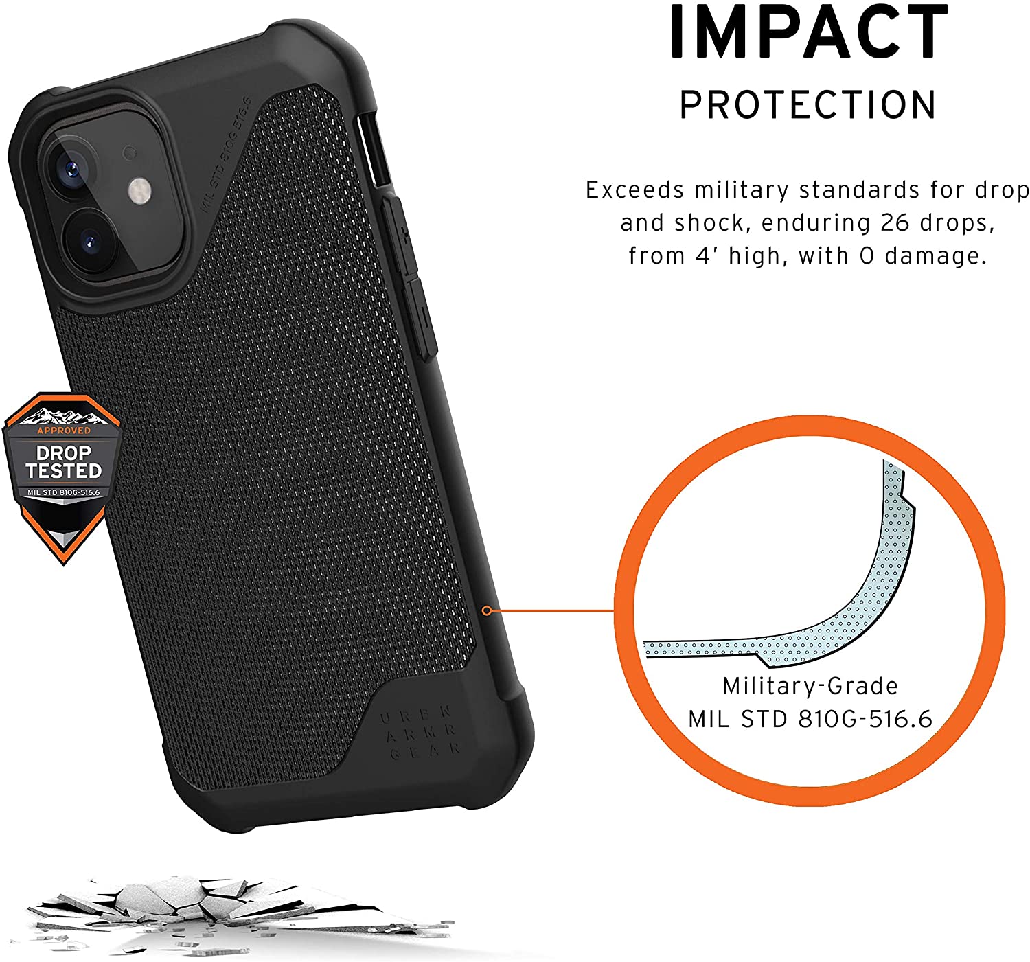 UAG iPhone 12 mini Metropolis LT FIBR ARMR Case - Kevlar FIBR ARMR combines a drop tested armor shell with a high strength abrasion resistant folio cover to protect your device from whatever life may throw at you. Durability and functionality - provides added grip support and stands up to cuts, tears, and wearing Crafted with elevated materials and seamless fabric inlay and features impact resistant bumpers for added protection against drops and bumps Protective flip folio cover with 3 credit card storage and viewing stand for hands-free viewing mode Ultra-responsive oversized tactile buttons deliver a crisp, clean click-feel for improved functionality. Compatible with wireless charging and Apple Pay Meets military drop-test standards [MIL STD 810G 516. 6] providing increased shock protection