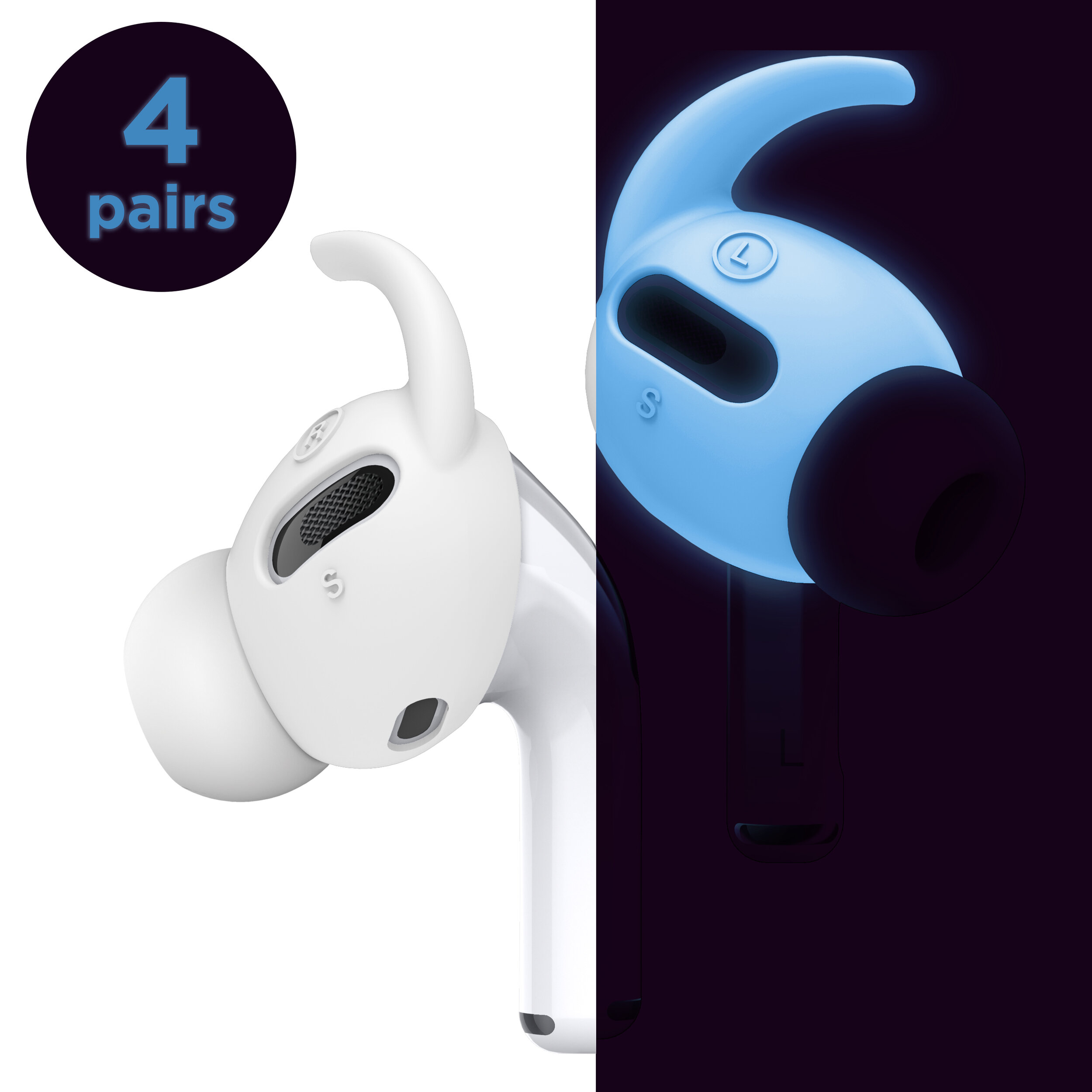 AirPods Pro Earbuds Hook Cover [4 Pairs: 2 Large + 2 Small] Earbuds Hook Cover HOLDS YOUR AIRPODS PRO SECURELY and prevents it from falling out. Great for running, jogging, cycling, gym and other fitness activities. Two size options are available to find your best fit. THE PROBLEM WITH AIRPODS PRO IS THAT it can get dirty during continued use or workouts. The EAR TIPS COVER solves this problem by covering your AirPods Pro with a layer of scratch-free silicone that DOES NOT HINDER ANY FUNCTIONS! elago’s COVERS MORE SURFACE AREA than leading competitors - ensuring BETTER PROTECTION! MOST COMPLAINTS ABOUT SILICONE COVERS ARE that it doesn’t fit well or last long, but our designers created a cover that is like a SECOND SKIN THAT LASTS! Since the cover does not make contact with anything and acts as a PROTECTIVE BUFFER, it stays on for longer PROTECTING AGAINST DIRT, DUST, and OIL FROM DAILY USE. IF ANYTHING DOES WRONG, DON’T HESITATE TO contact our customer service team! They are highly skilled and have been satisfying customers for years! elago is a DESIGN COMPANY FIRST AND FOREMOST. Our motto is SIMPLE SOPHISTICATION because we create products that are USEFUL AND AWESOME! WE ALWAYS CREATE products that WE OURSELVES USE, so we know YOU WILL LOVE IT!