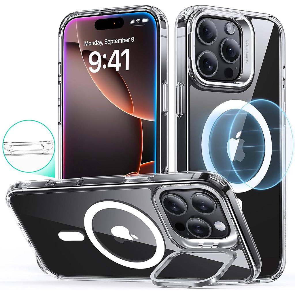 About this item Compatibility: only for iPhone 16 Pro Max; doesn't include camera lens protectors or built-in camera lens protector Stronger Magnetic Lock: powerful built-in magnets with 1,500 g of holding force enable faster, easier place-and-go wireless charging and a secure lock on any MagSafe accessory Adjustable Stash Stand: positioned around camera frame to stay hidden when folded away while keeping MagSafe ring 100% unobstructed; enjoy a freely adjustable and stable view for watching shows whenever, wherever Built to Last: robust and durable zinc-alloy construction ensures stand stays looking like new while hinge is lab tested to retain its strength after more than 3,000 uses Military-Grade Protection: shock-absorbing Air Guard corners combine with raised screen edges and Camera Guard to ensure test-certified protection against drops, bumps, and scratches