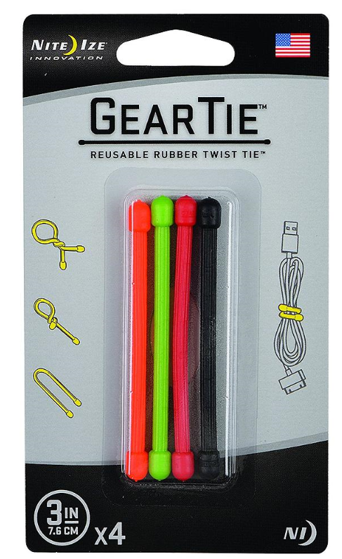 NiteIze Gear Tie® Reusable Rubber Twist Tie 3 in. - 4 Pack The patented Gear Tie Original is the most versatile way to wrap, hang, and organize nearly anything. Featuring a strong bendable wire interior that holds its shape and durable rubber exterior, the Gear Tie Originals can be twisted, tied, and reused over and over indoors and outdoors. Discover why so many people find Gear Ties indispensable. PRODUCT INFORMATION: There are so many ways our 3" Gear Tie is useful. With a fully bendable wire interior and colorful, durable, soft rubber exterior, the Gear Tie is the perfect all around organizer. Keep computer cords, headphones and ear buds bundled and untangled, close produce and snack bags (the Gear Tie is perfect for goody bags!) shore up plant and flower stems and much, much more, all with a simple twist. PRODUCT DETAILS: Use Gear Ties in the garage, on the boat, in the home, and in countless other places where things need to be secured and organized Waterproof and safe for use in fresh or salt water without damage UV resistant - will not be damaged or destroyed by extended sun exposure Tough rubber shell provides excellent grip Use indoors and outdoors in any weather Strong wire inside holds its shape Won't scratch or mark Twist it, tie it, reuse it Thousands of uses! Gear Tie Assortment Packs offer 8 and 12 packs of Gear Ties in a variety of colors and sizes Gear Tie ProPacks make tackling multiple wrapping, hanging, or looping jobs a breeze Dimensions: 3.00" x 0.24" x 0.24" | 76.2mm x 6.20mm x6.20 mm Weight: 0.07oz | 2.00g