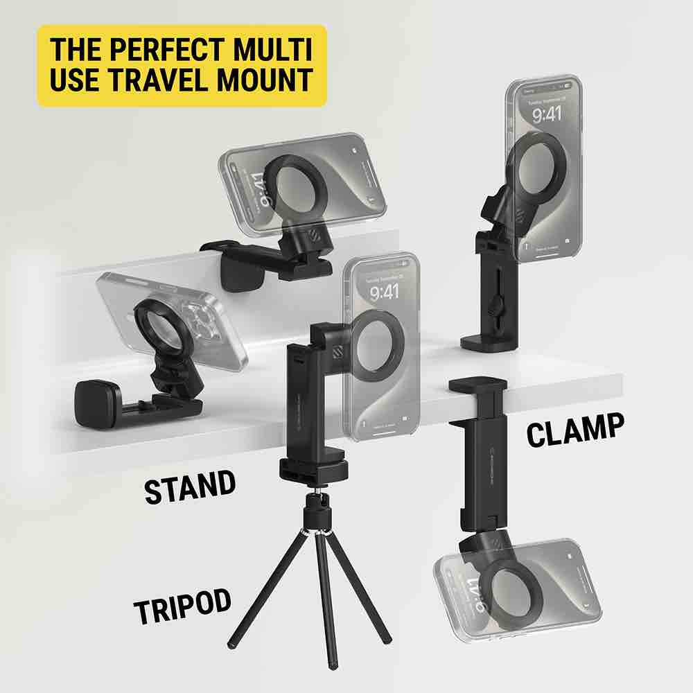 • A circle of magnets in the mount head holds iPhone models 12 and later using their built-in MagSafe magnets. It can also hold a MagSafe compatible wireless charging puck. • Holds iPhone models X, 11, SE and Android phones using the included metal ring that can be attached to the back of your phone. • The base of the mount clamps securely to the edge of an airplane tray table, or a desk, table or counter up to 1.5" thick. It includes a removable ¼" tripod adapter to hold your phone steady for photos or videos. • Holds your phone securely to make calls, take photos, watch or shoot videos. • Works with iPhone models 12 and later. Use with included metal ring for iPhone models X, 11, SE and Android phones. Included: Magnetic Phone Mount, ¼" Tripod Adapter, Metal Ring